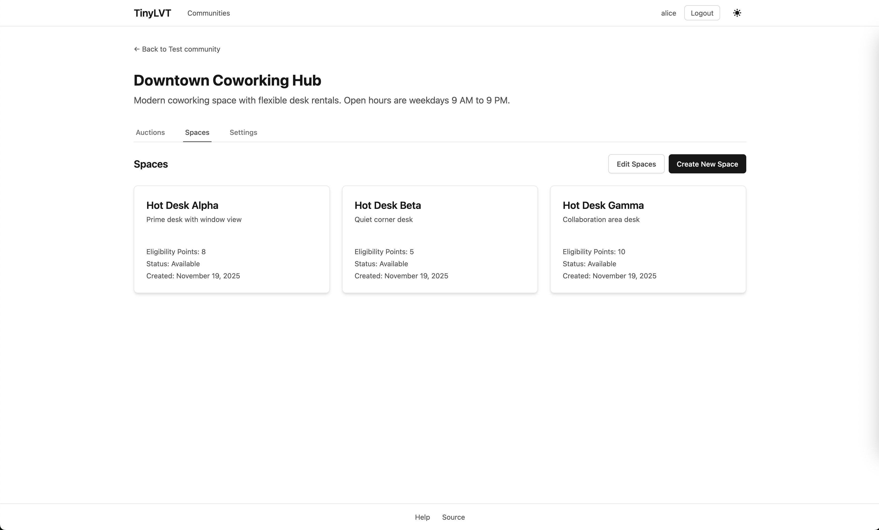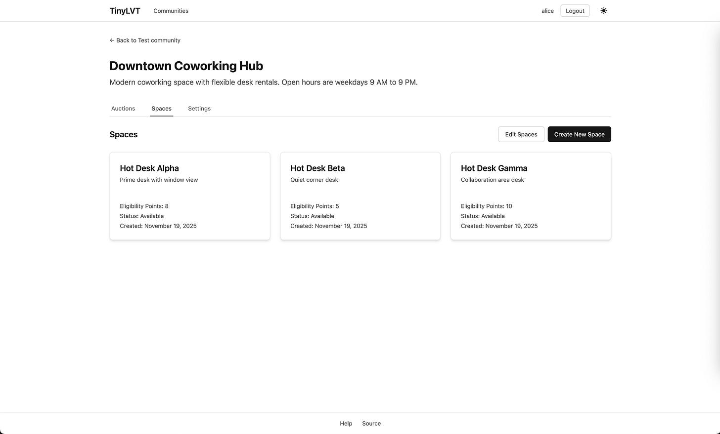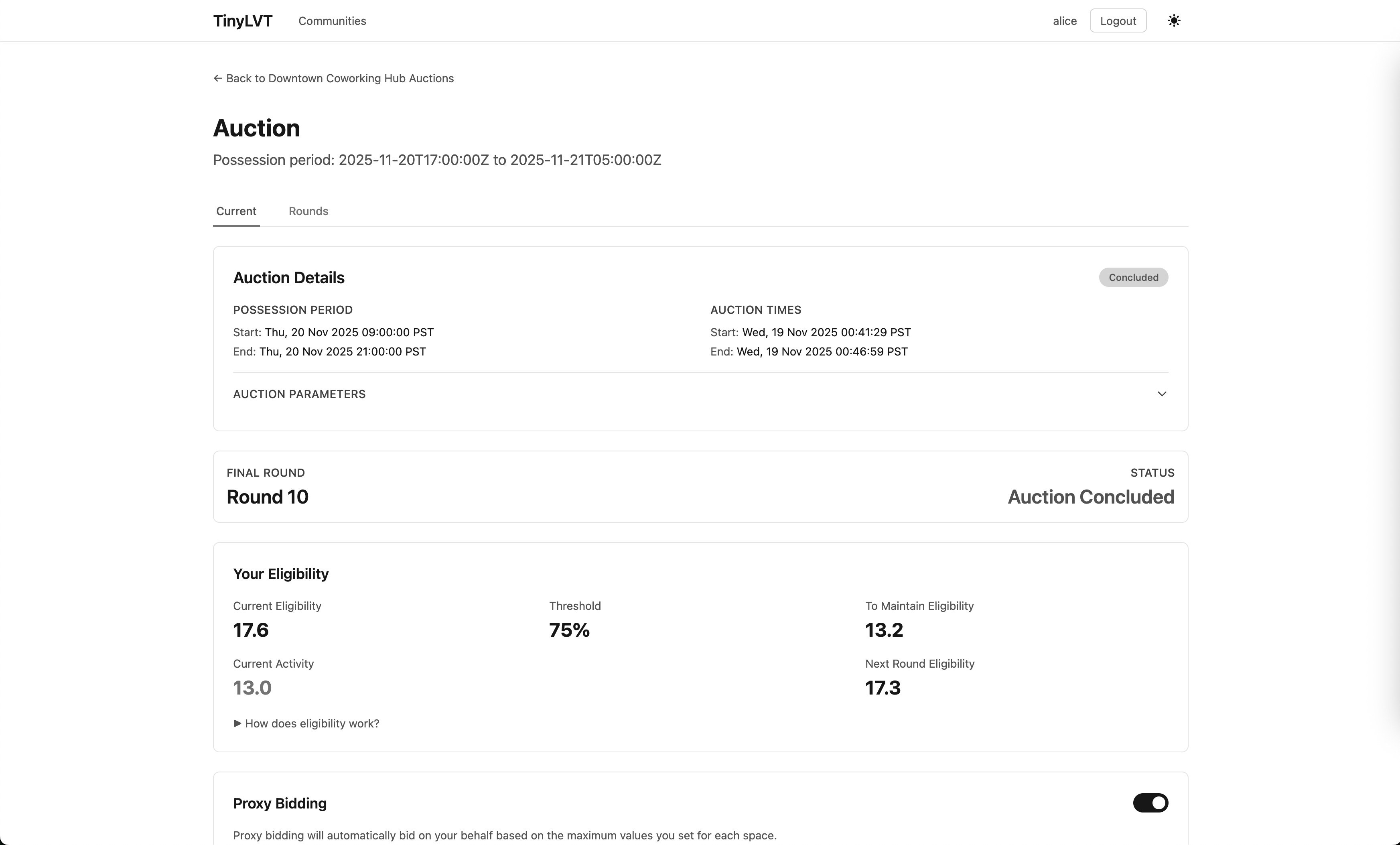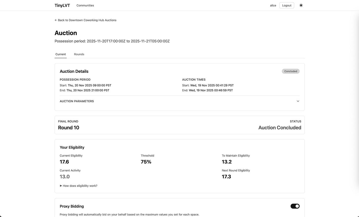 So, to that end, I’ve been working on a project called TinyLVT to make this mechanism practically available and usable, and it’s now live at tinylvt.com.5 You can: