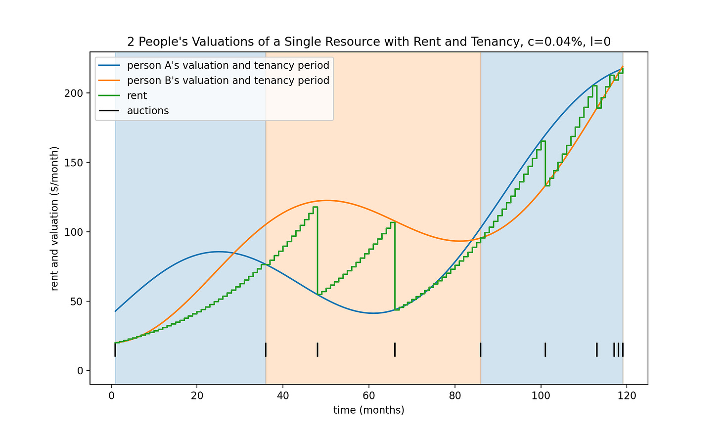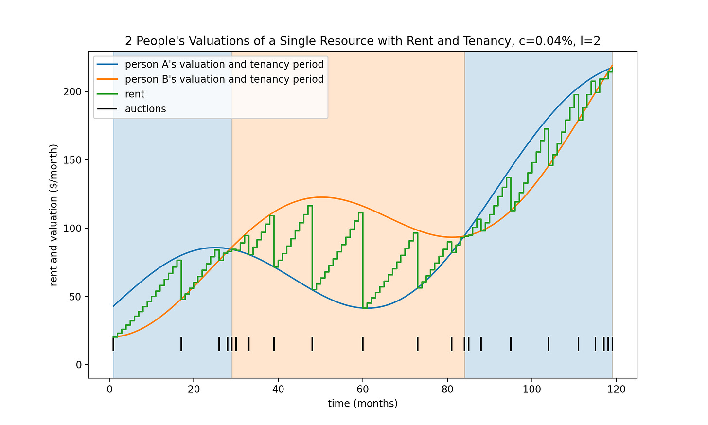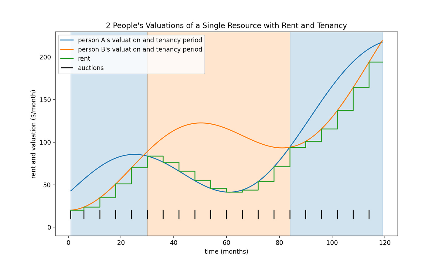 We can fix this by auctioning the space regularly. At each auction, the rental value of the space is updated. If the current occupant now values the space less than the other person, then they give up the space and accept payment of half the rent instead. If the space was auctioned every month, then things would look like this:
