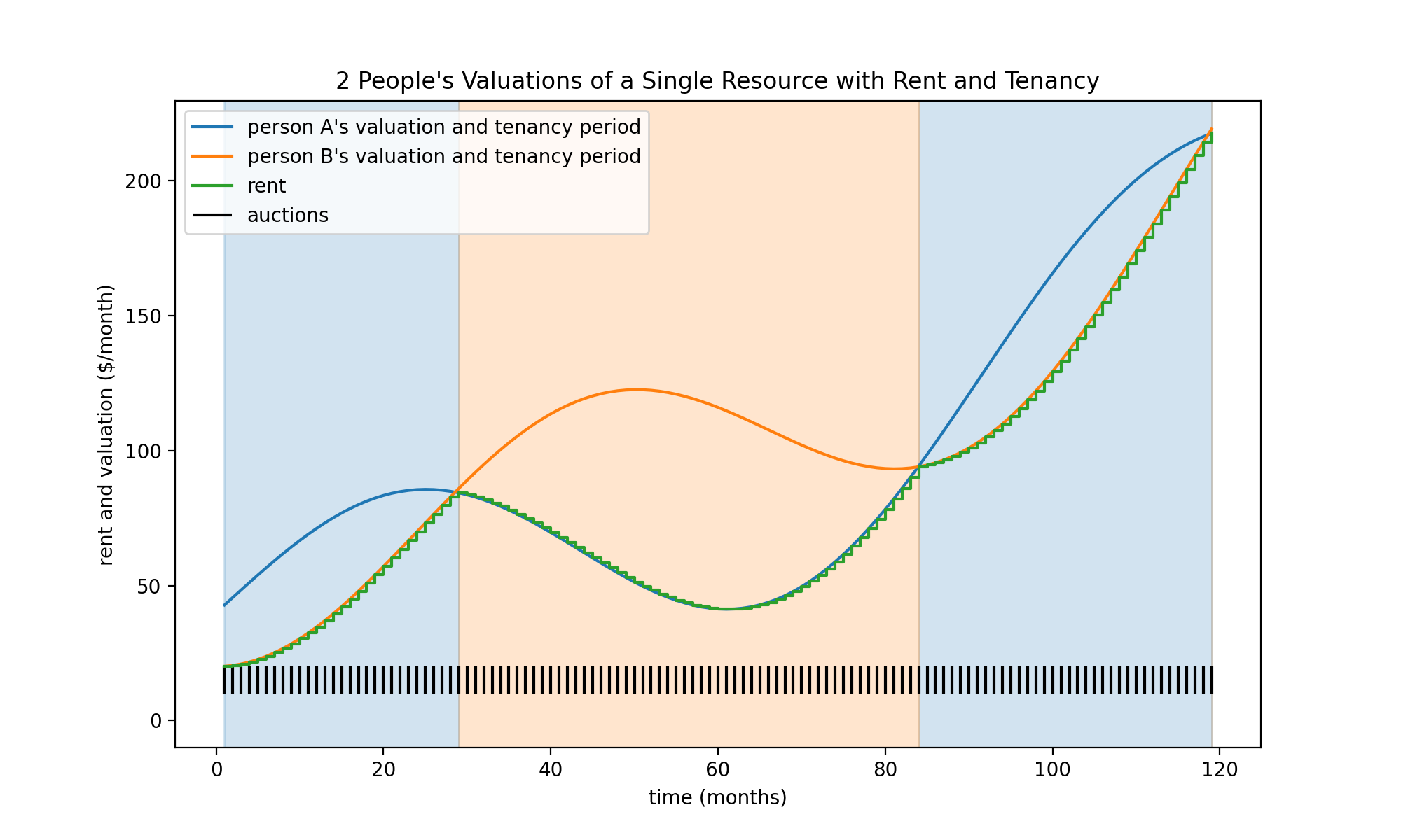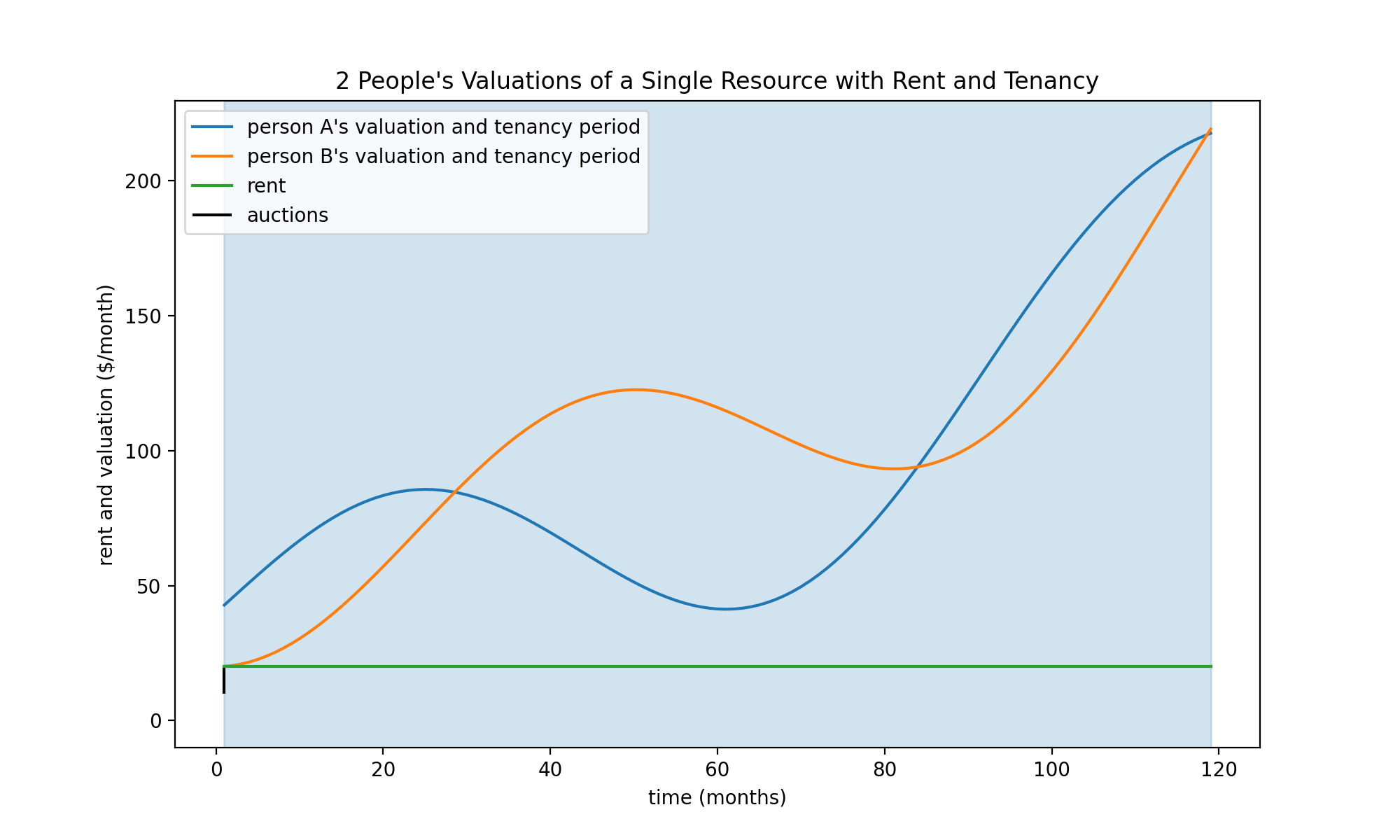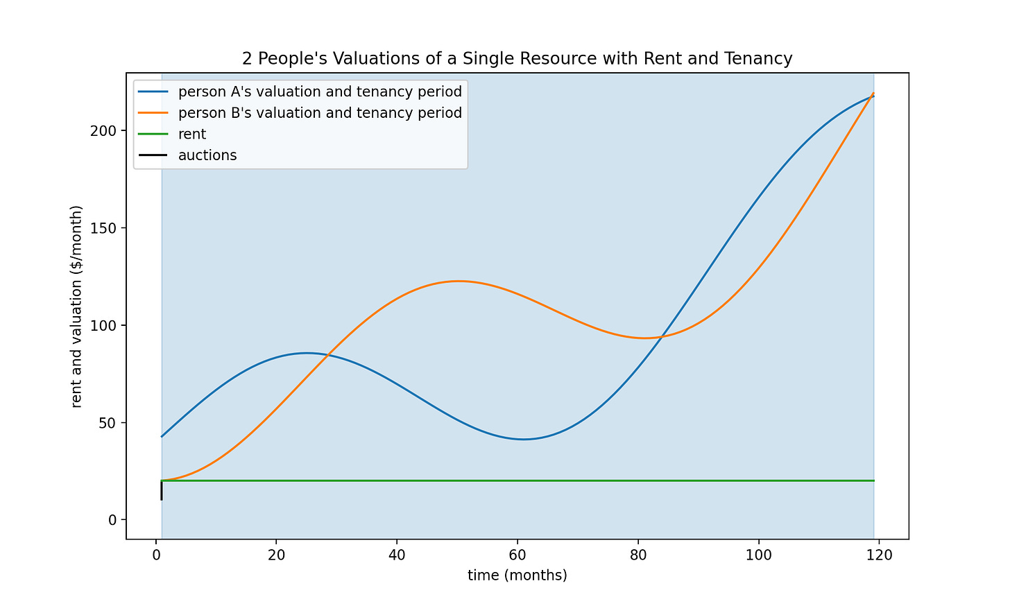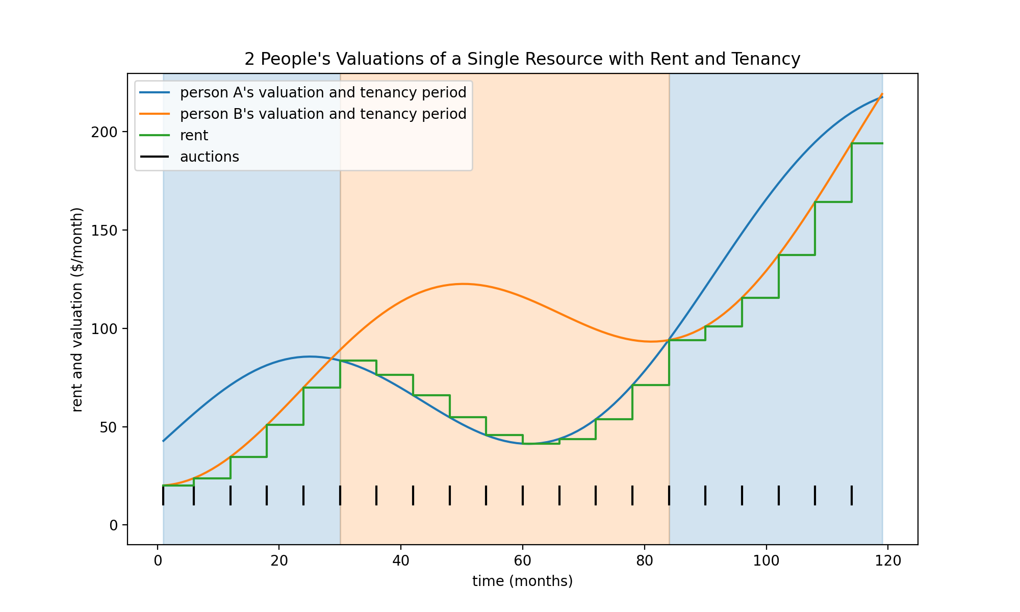 We can fix this by auctioning the space regularly. At each auction, the rental value of the space is updated. If the current occupant now values the space less than the other person, then they give up the space and accept payment of half the rent instead. If the space was auctioned every month, then things would look like this: