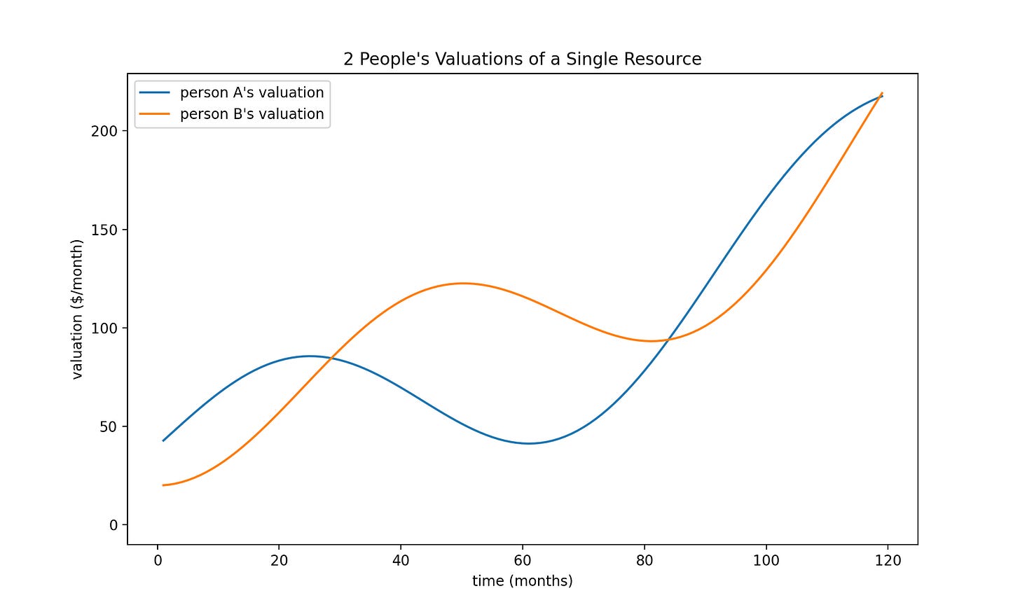 People’s valuations also change over time due to changing preferences and life circumstances. For our example we will assume the valuations of our two individuals look like this over a hypothetical 10-year period: