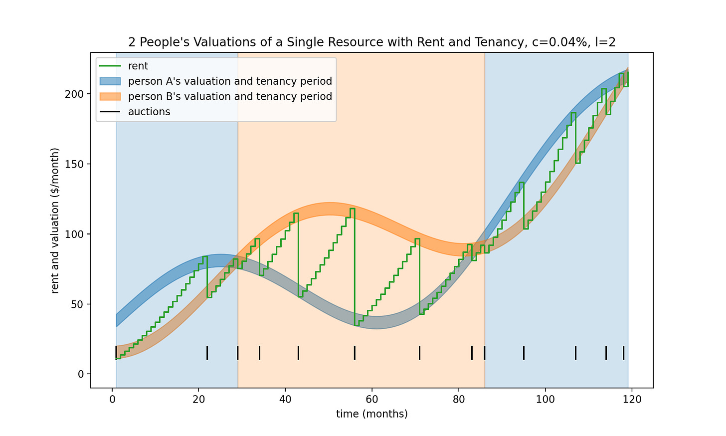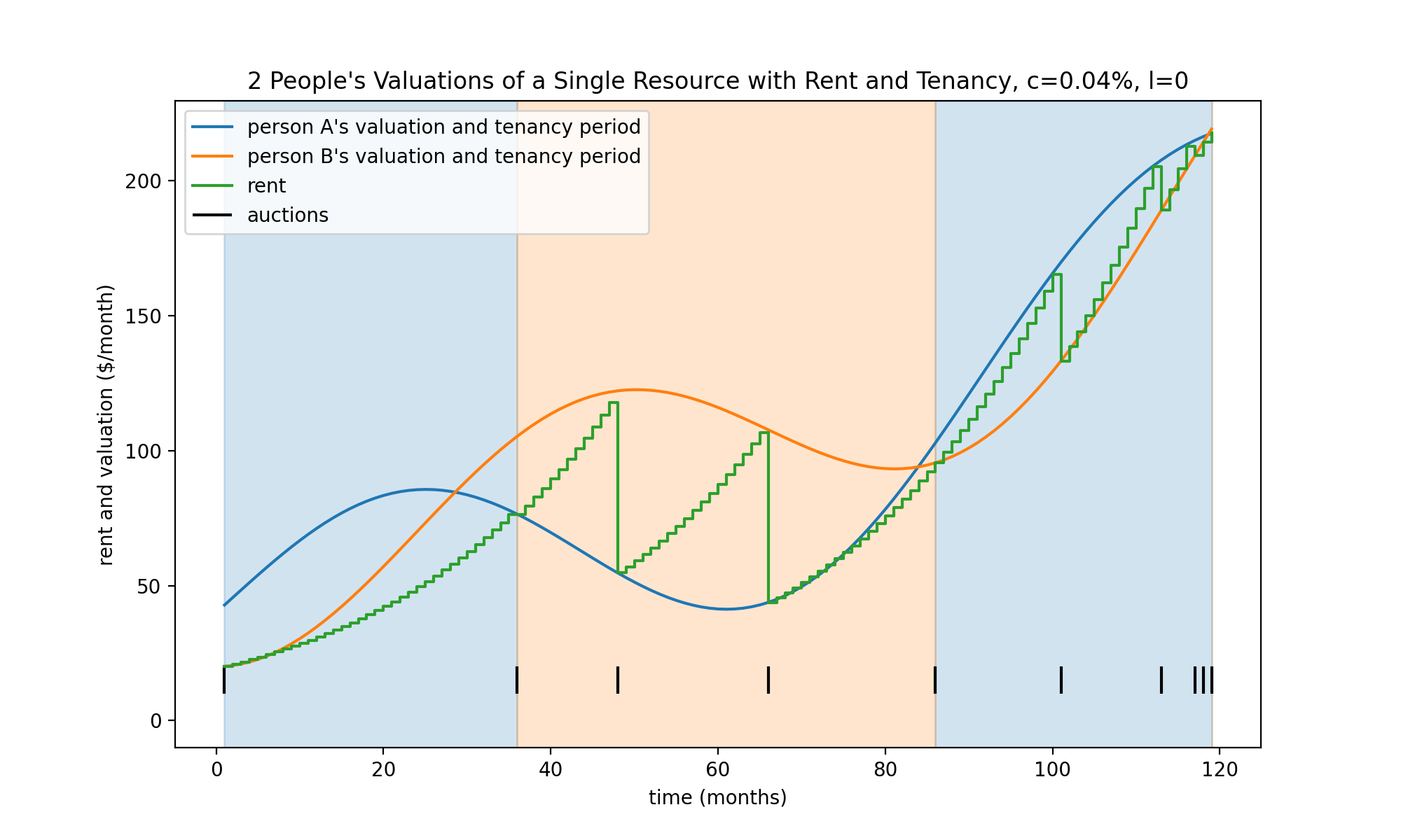 This once again tracks the true rental value quite closely. What we’ve gained with this method over auctions that simply repeat on a fixed schedule is the freedom for the current occupant to pick, with some latitude, the times at which they wish to auction the space and risk losing it. If the timing is poor for the occupant to risk losing the space at auction, they can buy more time by accepting a predicable increase in the rental value.