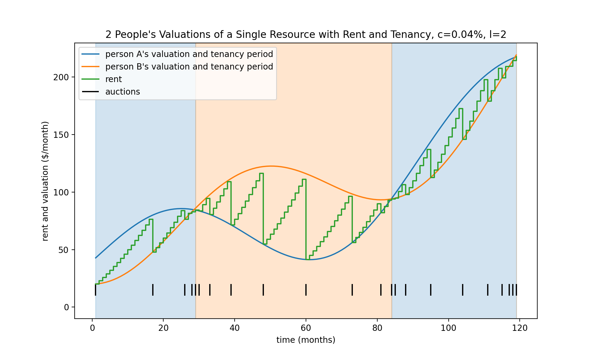 This does have some drawbacks, however. It may not be desirable to reappraise the value of the better space every month, and the current user is frequently at risk of losing the space at these regular auctions. This limits the length of time over which the occupant can confidently plan to have the space for. (While the curves are smooth in our example, and the current occupant can thus anticipate when the rent is nearing their valuation, this is not necessarily the case in other situations where valuations change more abruptly.)
